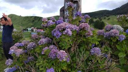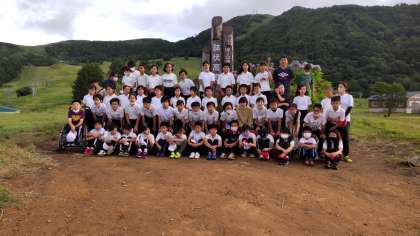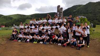 ラジオ体操の後、モニュメント前で学年写真を撮りました。まだ、アジサイが咲いており、高原の涼しさがわかります。