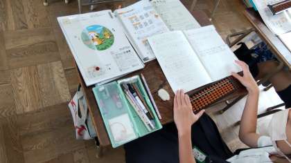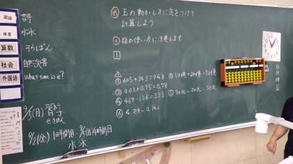 黒板に教授用の大きなそろばんを設置したり、書画カメラを使って電子黒板に球のはじき方は払い方を映しての指導です。子どもたちも真剣に取り組んでいました。