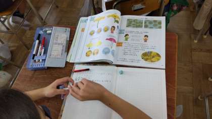 5年生は理科の学習で、ヘチマを教材にして、雄花と雌花の学習です。それぞれの花の特徴をスケッチして学習していました。次の時間は花粉の学習かな?