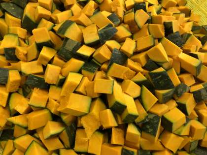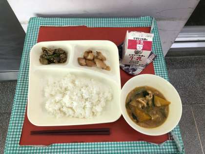 今日のみそ汁には、かぼちゃ・たまねぎ・うすあげ・こまつな(冷)がはいっています。