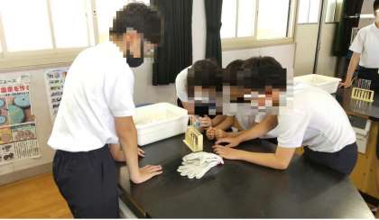 6年生は理科室で、水よう液の観察をしていました。炭酸水・重曹水・・塩酸・石灰水などの5種類の水溶液(水もありました)の様子をも足り、においをかいだりという活動をしていました。これから水よう液の酸性・中性・アルカリ性をリトマス紙で調べていきます。また、金属を溶かす水よう液についても学習していきます。保護メガネをかけて、真剣に観察していました。