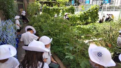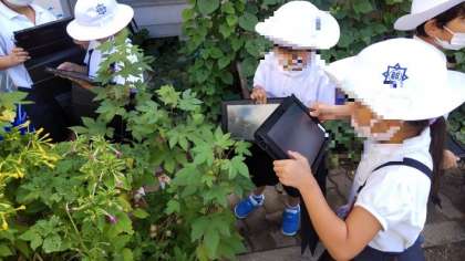 1年生はタブレットを使って、校庭のいろいろな植物を観察していました。オシロイ花・綿・ヘチマ・などなど。うまく撮れたでしょうか?