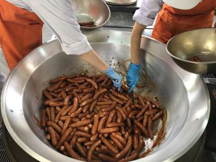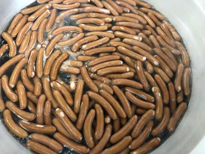 釜でゆでたウインナーに、砂糖・ケチャップ・とんかつソース・ウスターソース・湯をあわせ、でんぷんでとろみをつけたタレをからませていただきました。