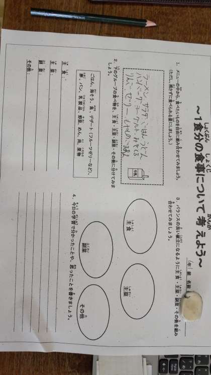 区内の栄養教諭の方に来ていただいて、栄養指導がありました。まず、自分の食べたい給食のメニューを考え、「赤の食べ物=主食」「黄色の食べ物=主菜}「緑の食べ物=副菜」