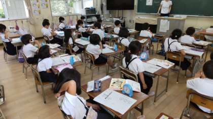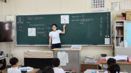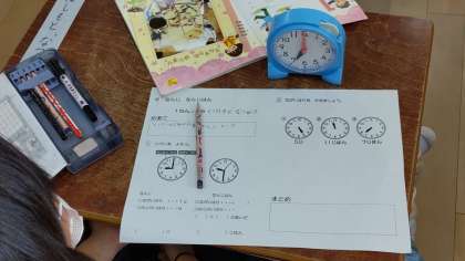 1年生は時計の学習をしていました。十進法と十二進法が混じっており、1年生の算数でとても理解が定着しない学習です。長針と短針の位置を確かめていました。9:30を9時30分ともいうし、9時半ともいうことも学習していました。