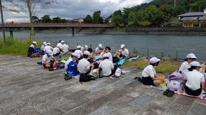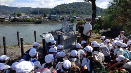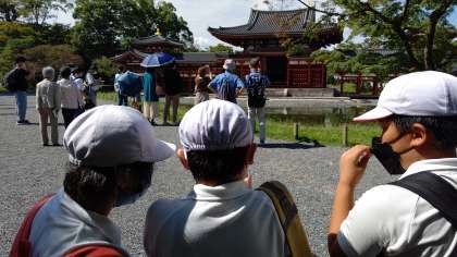 紫式部の石像や平等院鳳凰堂、平等院ミュージアムなど様々なポイントを那須先生の興味深い話を聞きながら見学しました。観光客の中には足を止めて、その説明に聞き入っている方もおられ、子ども達はとても勉強になったことと思います。また、持参した10円玉のデザインと実際の鳳凰堂を見比べる活動にも真剣に取り組んでいました。
