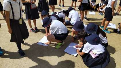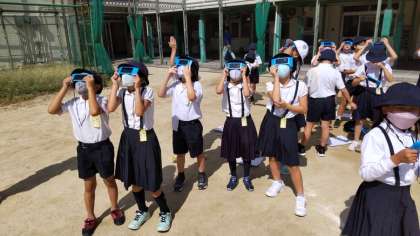 3年生は理科の学習で「太陽の動き」を学習します。日時計を使って、影の向きや長さを観察していました。また遮光版を使って、実際の太陽も観察していました。「月みたい」という言葉が聞かれました。