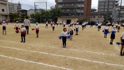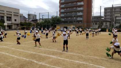 運動会練習の3年生の様子です。運動場での練習です。カラフルな飾りが両方の端についた棒のようなものを持って踊っています。やっぱり何かを手に持つと、動きが変わります。