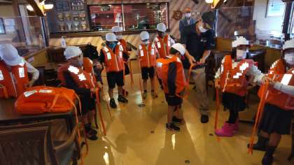 その後、「サンタマリア号」に乗って、ロープワークや救命胴衣のつけ方を経験したり、舩の航海灯のお話などを聞いたりした後、大阪湾を45分間、遊覧しました。
