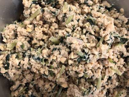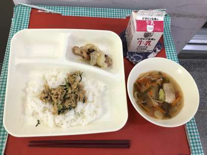ツナ大豆そぼろは、しょうが、ツナ、大豆、だいこん葉をいため、甘辛く味付けし、ごはんといっしょに食べます。主に体をつくるもとになるたんぱく質やカルシウム、鉄を多く含むおかずです。