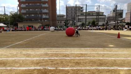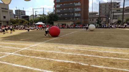 4年生による、大玉転がしです。今、赤109点、白105点。競っています。