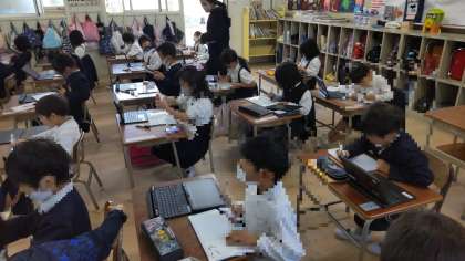 1年生は、運動場の秋を見つけに行ってました。キンモクセイの花はもう終わっていましたが、においがしないかにおっていました。