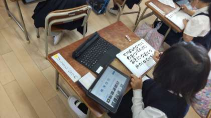 カキやザクロなども見つけていました。だんだん気温が下がっていっていることを、鉄棒をさわって感じていました。その後、タブレットとホワイトボードを使って、見つけたことを記録していました。