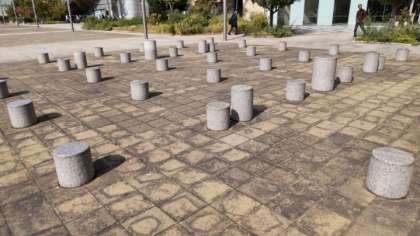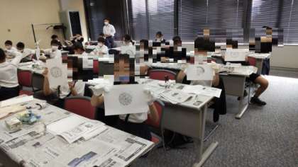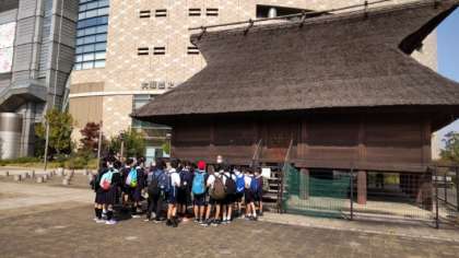 一クラスが拓本づくりをしているあいっだに、もう一クラスは博物館内の地下にある「難波の宮」の柱の跡の説明とを受け、見学しました。歴史博物館の前には、柱の跡に丸く印がつけてあることやいすや机のような支柱があることを教えてもらいました。今まで、弁当用の腰掛やテーブルだと思っていた子がほとんどでした。また、高床式倉庫の復刻版の見学も行いました。