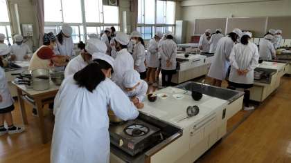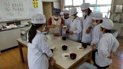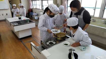 5年生は先週、鍋でご飯を炊きました。きょうは、煮干しでだしを取って、みそ汁作りです。協力して作業していました。お味噌汁には、お豆腐、ニンジン、ネギなどが入っていました。