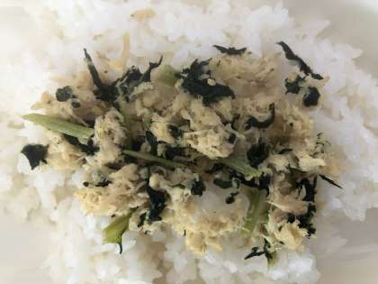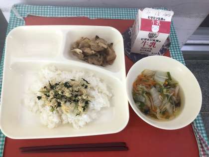 今日の給食では、ささみ(油漬け)とだいこん葉をいためて料理酒、うすくちしょうゆ、こいくちしょうゆ、湯を加えて味付けしごはんの上に添えていただきました。