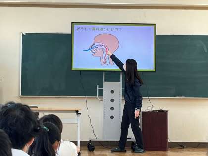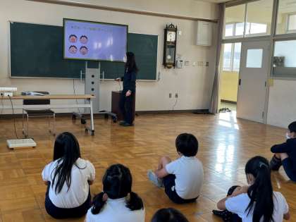 保健指導では、かぜやインフルエンザの予防にもなる「あいうべ体操」を行いました。あいうべ体操を行うことで、口もとや舌の筋肉が鍛えられ、自然と鼻呼吸ができるようになります。鼻呼吸をするとどうして風邪予防につながるのかも子どもたちに話しました。