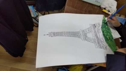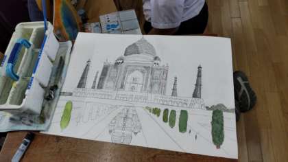 6年生は写真を参考にして、世界の建物を描いていました。東京タワー、タージマハール、ドイツの城などなど…。しーんとした中で、筆先を使って点塗りをしていました。細かい作業を続けられるのは、もさすが6年生ですね。