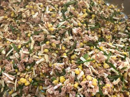・ピザソース、ツナ、コーン、ピーマン、チーズを混ぜ合わせます。