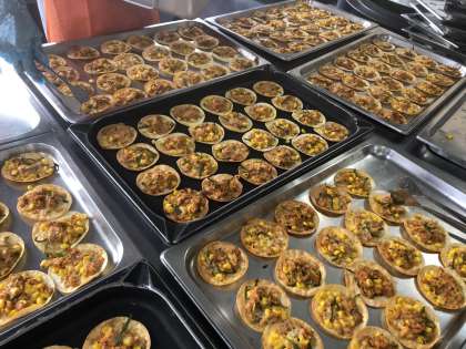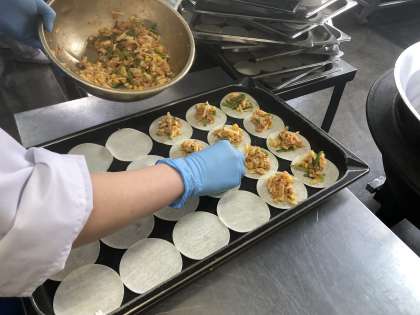 ・ギョーザの皮に上の具をのせて焼き物機で焼きました。