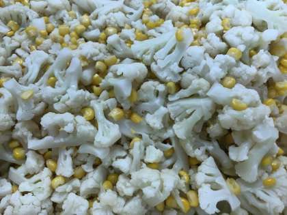 カリフラワーは、一年中出回っていますが、一番おいしい旬の時期は11月から3月頃です。この時期のカリフラワーは、つぼみの部分が大きく、味もよくなります。今日の給食では、コーンと一緒にピクルスにしています。