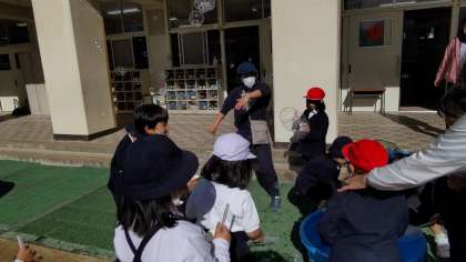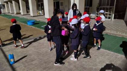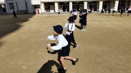 1年生が、運動場で「しゃぼん玉」遊びをしていました。大きなわっかの針金や、ハンガー団扇の骨組みなどなども登場し、歓声をあげていました。