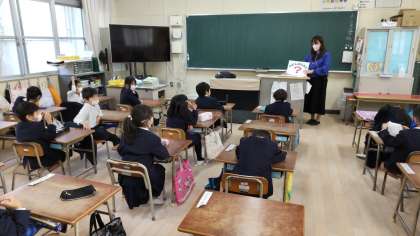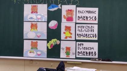 東都島小学校の安藤栄養教諭に来てもらい、今学期2回目の栄養指導がありました。たべものは、いのちをいただくもの、作ってくれたり運んでくれたりした人にひとに感謝をすること、調理した人に感謝をすることなどとともに、強い体を作るという学習でした。食べ物を3つの種類に分け、さかな、ご飯、野菜は、それぞれ、体を作ったり、エネルギーになったり、体を守るという学習です。この後きっと、「赤」「緑」「黄」の食べ物の学習に進むと思います。