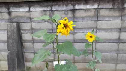 その横に、なんとヒマワリが咲いていました。夏に立派な花が咲き、種を取ったひまわりの子どもが土に落ちて、この寒い中、花をつけていました。「ド根性ひまわり」と呼んでいます。