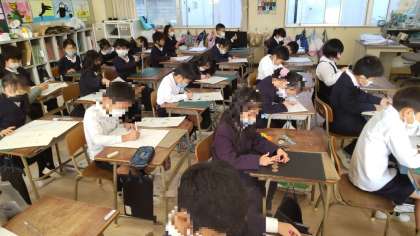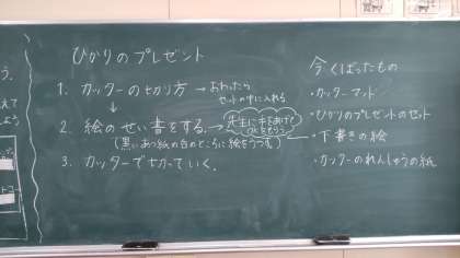 2年生は、図画工作科で初めてのカッターナイフを使って、「光のプレゼント」(ステンドグラス風)を作り始めていました。カッターでいろいろな窓を開け、そこに裏からカラーフィルムを張っていきます。けがをしないように気を付けて、集中して作業をしていました。
