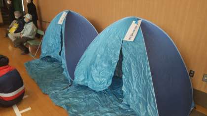 今から28年前の阪神淡路大震災を振り返って、地震の大きさや揺れの映像を視聴した後、その後の避難生活に必要な「防災ベッド」と「防災トイレ」を組み立てたり、火災の時の消火器の使い方(水消火器です)を学習しました。