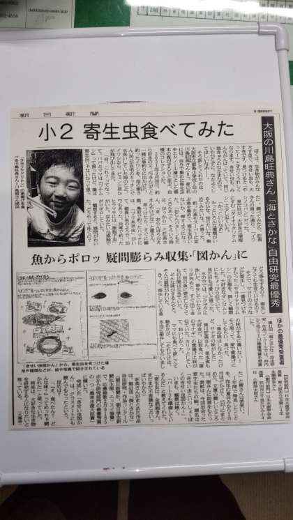 本校の2年生の川島旺典さんが、今年の夏休みに「イワシの寄生虫」について自由研究をし、第41回「海とさかな」自由研究・作品コンクール(朝日新聞社・朝日学生新聞主催、ニッスイ協賛)で、応募総数2万9185点から研究部門の最優秀賞の一つ、「農林水産大臣賞」に輝きましたという記事が載りました。