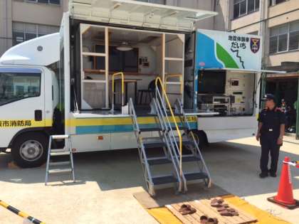 地域諸団体の方々もたくさんご協力いただいています。今年度は防災担当の方が地震体験車を呼んでくださいました。消防隊員の方々も来てくださっています。