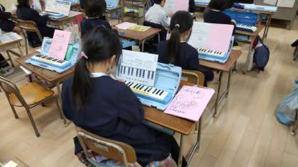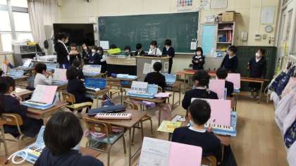 1年生は「きらきら星」「おもちゃのチャチャチャ」の2曲を、鍵盤ハーモニカ、木琴、鈴などで合奏の練習をしていました。とってもかわいらしいです。