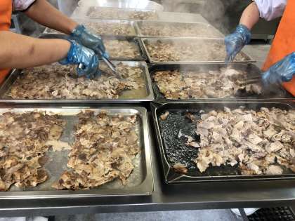 豚肉には、主に体をつくるもとになるたんぱく質が多く含まれています。また、体のつかれをとるはたらきがあるビタミンB1も多く含まれています。今日は、しょうが、にんにく、オイスターソース、こいくちしょうゆ、綿実油で下味をつけて焼き物機で焼きました。