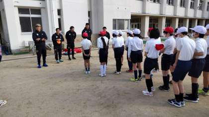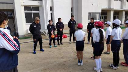 今日は6年生対象に、今年、ラグビーのリーグのディビジョン3に新設された、「大阪レッドハリケーンズ」のチームから5名のラガーマン来航され、6年生の子どもたちにラグビーを教えてもらいました。