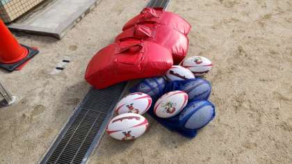 準備運動の後、ボールを触らせてもらい、パスやキックの練習、そして走りながらのパスなどを経験しました。また、「あたり」マシーンにも体当たりしていました。