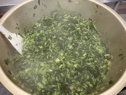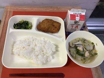 *今日の給食では、ゆでたこまつなに、すりごま、砂糖、うすくちしょうゆをあわせて煮たタレをかけていりごまをふってあえました。