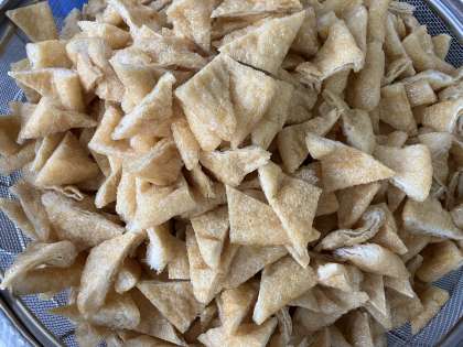 なにわうどんは「きつねうどん」をイメージしています。三角形に切って、甘辛く煮たうすあげ、かまぼこ、はくさい、青ねぎがはいったうどんにとろろこんぶを入れて食べます。給食では、うすあげを三角に切ってだし、みりん、こいくちしょうゆをあわせてミニバットで煮ています。