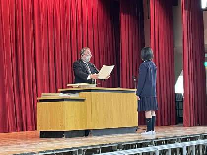 児童集会で、表彰状と副賞を校長先生からいただきました。