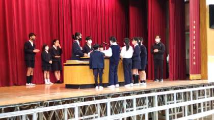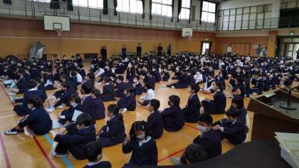今日の朝まで雨が降っていて、運動場が使えなかったので、急遽、5年生が講堂の卒業式用のいすを片付け、全校集会を行いました。先週の「宝探し大会」の表彰式と簡単なゲームをしました。また、校長先生から「よい歯は口」の表彰状の授与もありました。早咲きの桜が行動の裏で満開になっていました。今週末は、いよいよ6年生の卒業式です。