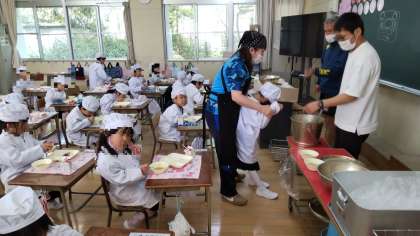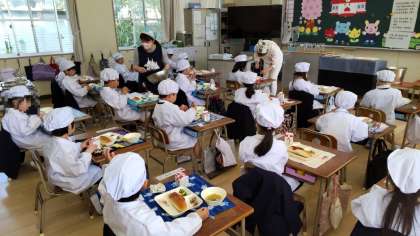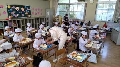 一年生は初めての給食を食べました。メニューは豚肉のガーリック焼き、スープ、サンド豆とコーンのサラダ、牛乳、パン、イチゴジャムでした。6年生のお兄さんやお姉さんに3時間目の休み時間に食器やパン、牛乳などをを運んでもらい、給食の時間に大きなおかずだけを取りに給食室に行きました。給食調理員さんとも初めて会い、給食室の児童だまりを始めて通りました。