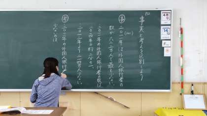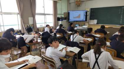 6年生は国語科で、事実と意見を分けて書こうということで、グラフから読み取ったことから、自分の意見をもち、順序ただしく書く学習をしていました。
