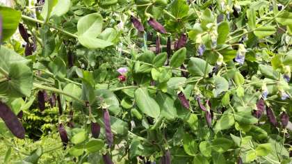 「ツタンカーメンのエンドウ豆」は、エンドウ豆の原種です。さやは紫色ですが、実は緑色です。しかしこれでエンドウご飯を炊くと、緑色ではなく、赤飯のようにご飯が紫色になります。不思議ですね。