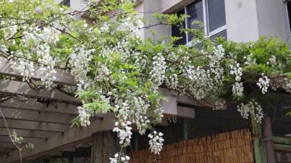 学校のフジも満開でした。都島小学校の「フジ」はうすむらさき色の種類ではなく、白い藤です。