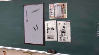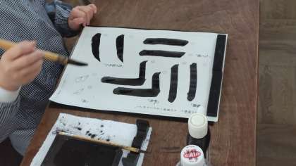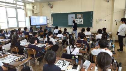 4年生は毛筆の学習をしていました。まずは基本の確認、筆をまっすぐに持つこと、親指、人差し指、中指を使って手のひらにウズラの卵を掌でつかむように筆を持つこと、背筋を伸ばしてひじを張るなど基本の学習でした。そして、始筆の筆の打ち込みの仕方、終筆の止め方などをプリントを使って学習していきました。習字ト板を使って学習していました。水なのに墨のようになる黒板みたいなものです。