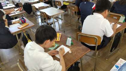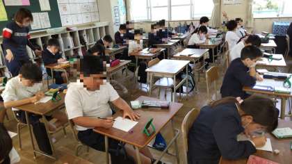 4年生は、小さな手鏡を使って、自分の似顔絵を描いていました。おそらく、教室の黒板の上に張り出して、クラスの目標を掲示すし、その周りに一人一人の自画像を張り出すのではと思います。参観の時に楽しみにしておいてください。
