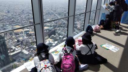 3年生は、天候に恵まれて環状線に乗って、阿倍野ハルカスに来ました。60階の展望台から大阪市を眺めています。