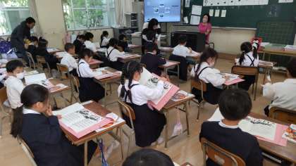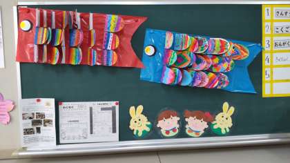 1年生の教室の背面掲示に、子どもたちが1枚1枚クレヨンで色を塗ったうろこを持ったこいのぼりが泳いでいました。さわやかな風に乗って、楽しい歌も聞こえてきました。なんと、教室には3人の先生がいました。一人は音楽専科の先生、もう一人は担任、もう一人はサポーターの方です。この人数で児童23人の1年2組を指導していました。きめ細やかな指導を心掛けています。