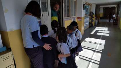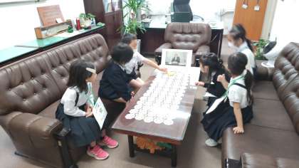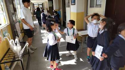 1年生が2年生に連れられて、学校探検をしています。校長室、管理作業員室、職員室、理科室など初めて入るお部屋もあります。校長先生から、名刺もいただきました。2年生もしっかり校内の案内ができました。