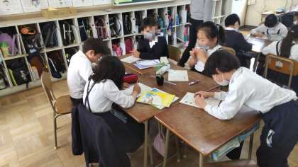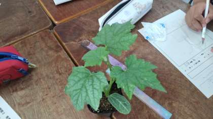 4年生はヘチマの苗を観察し、双葉と本葉の違いや「ツルマキばね」の様子などをスケッチしていました。写真でも残していますが、スケッチをさせるとヘチマの様子を隅々まで観察する必要があり、いろいろなことに気づきます。葉の筋の方向、色の違い、本葉の形や大きさなど観察力が10倍以上になります。